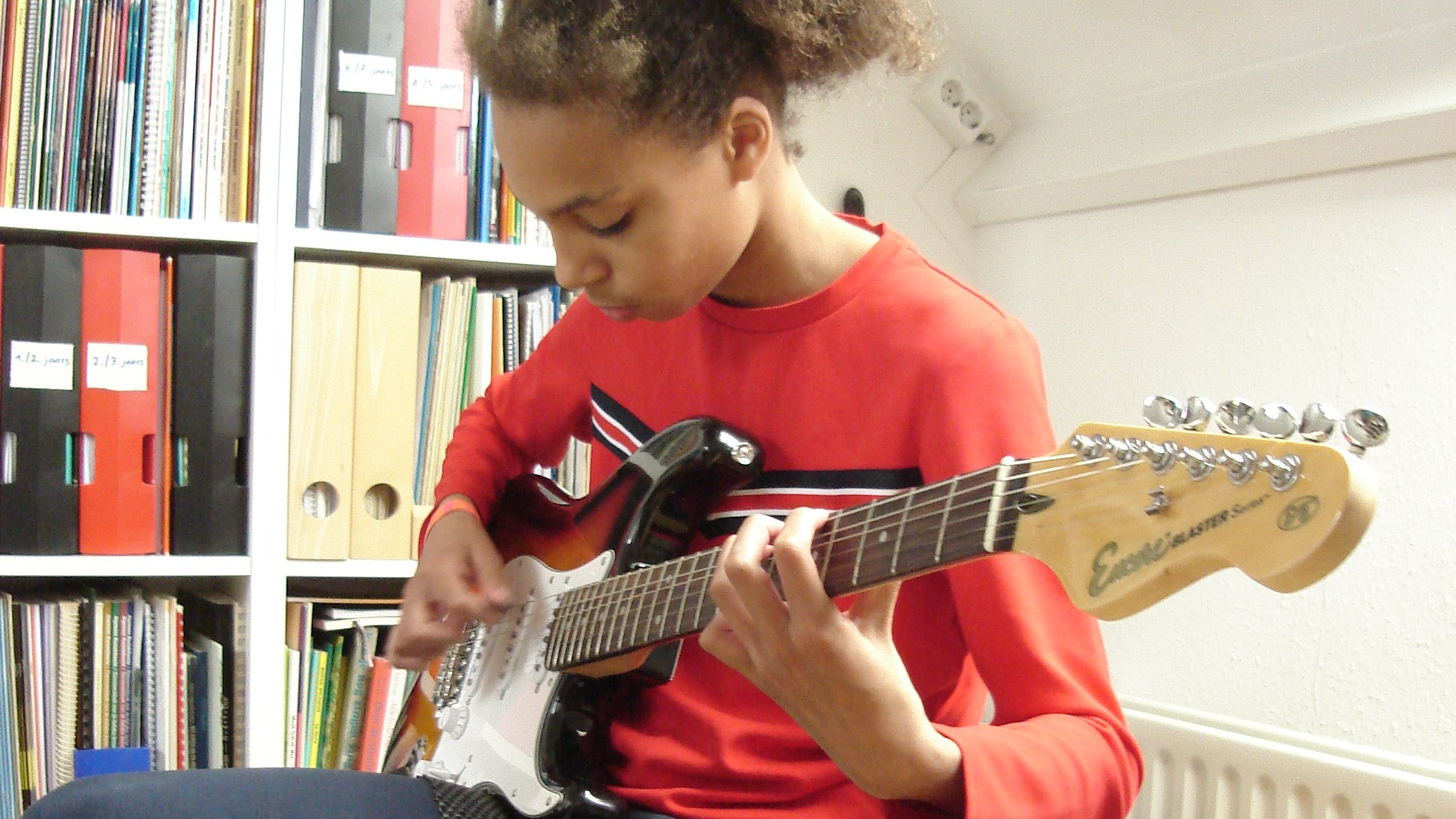Ik heb nu 1 jaar gitaarles en ik vind het heel leuk. Ook het samenspelen met de andere kinderen is heel gezellig. Na een jaar heb ik al heel veel geleerd en kan ik ook al een beetje noten lezen. Ik oefen steeds meer omdat het steeds leuker wordt. En de juf is heel lief en heel leuk.